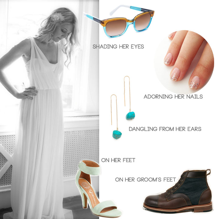Photo Credits: Bridal Fashion: Dress: Winifred Bean Daisy | Earrings: Heather Hawkins Turquoise Earrings via Shopbop | Nails: Sparkly Nails via POPSUGAR Beauty | Sunglasses: Sheriff&Cherry Colorblock Sunglasses via Shopbop | Boots: Reid Denim and Leather Boots via HELM Boots | Heels: Jeffrey Campbell Foxtrot Sandal via Nordstrom |