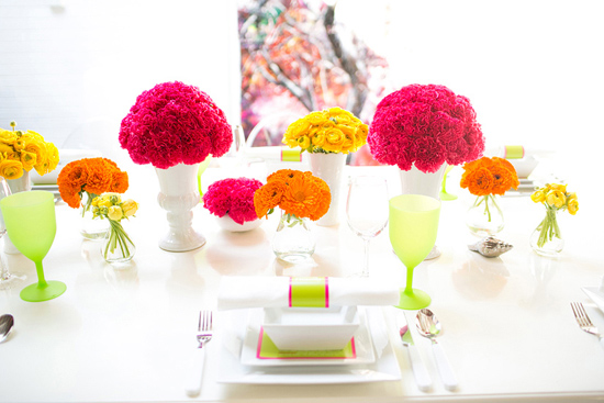 Skip the pastel pink roses and head straight to vivid orange dahlias. Add a volt of electric color to your wedding with neon-inspired decor.