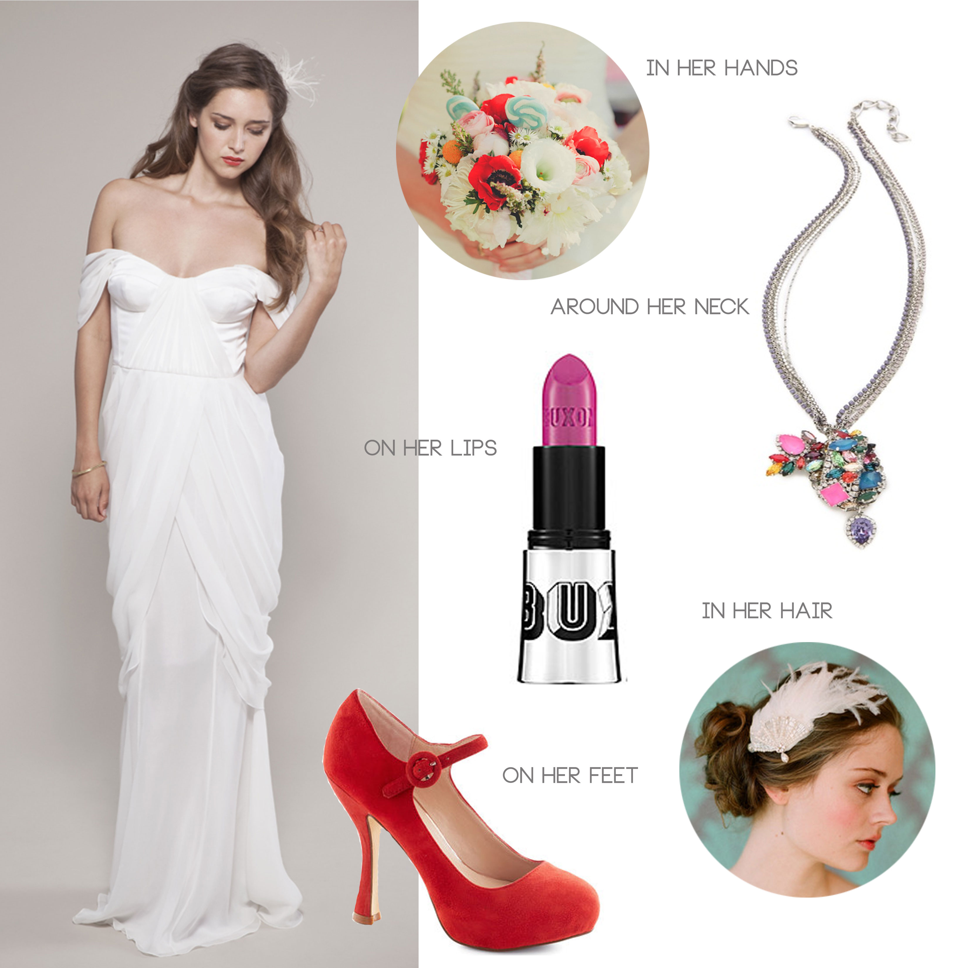 County Fairs are quintessential summer events. From deep-fried Oreos to prize winning pigs, communities gather together each summer to celebrate fun, food, and one another. Channel this fantastic fair energy into your summer nuptials! Winifred Bean’s Tulipe gown epitomizes vintage beauty with elegant chiffon and sweetly draping sleeves that can be worn on the shoulders or loosely over your arms. Accessorize with vibrant colors to add a touch of whimsy to your look: bright red poppies make a bouquet pop and a swipe of hot magenta over your lips brings a balance of pretty and daring to your bridal style. A multi-colored jewel necklace adds glamour while a delicate feather hair piece ties together a vintage country look. As a final touch, slip on your ruby red slippers: Red suede Mary Jane pumps add a vibrant splash of color to your Country Fair look.