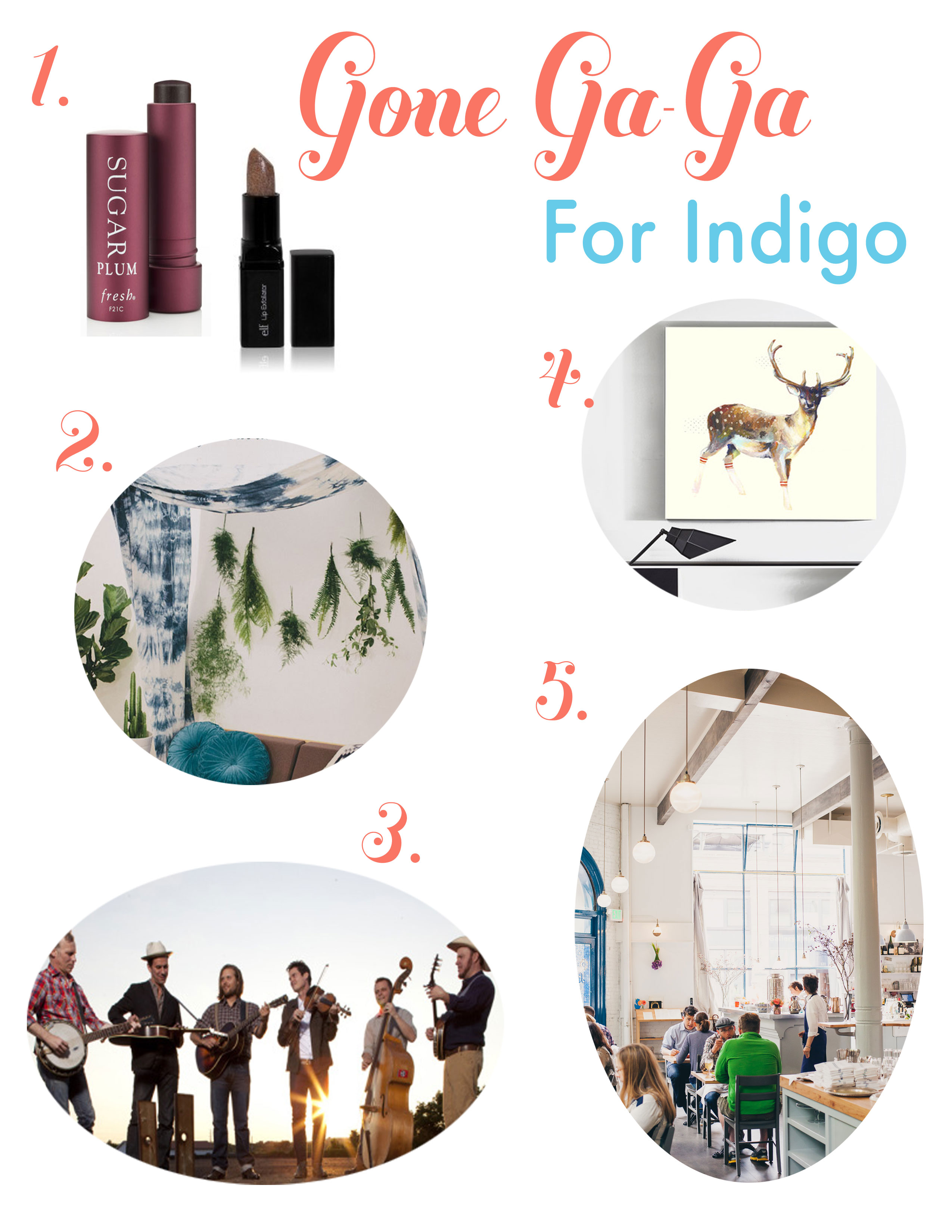 1. Sugar Lip Treatment in Plum via Fresh;  Lip Exfoliator via e.l.f. Studio | 2. Indigo Dyed Fabric DIY via Green Wedding Shoes  | 3. Bluegrass on the Green Musical Festival; image via  CBS Minnesota | 4. Deer Wearing Gym Socks via Eyes on the Walls  | 5. Bar Sajor in Seattle via Bon Appetit