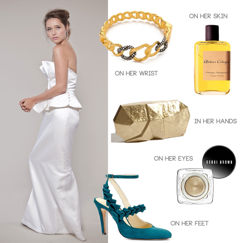 Iris Gown via Winifred Bean | Alexis Bittar Chain Hinge Bracelet via ShopBop | Atelier Cologne Orange Sanguine via Birchbox | Rafe New York Maryanne Minaudiere via Nordstrom | Bobbi Brown Metallic Cream Shadow in Goldstone via Sephora | Peacock Calf Suede Sandal Pump via Sarah Flint