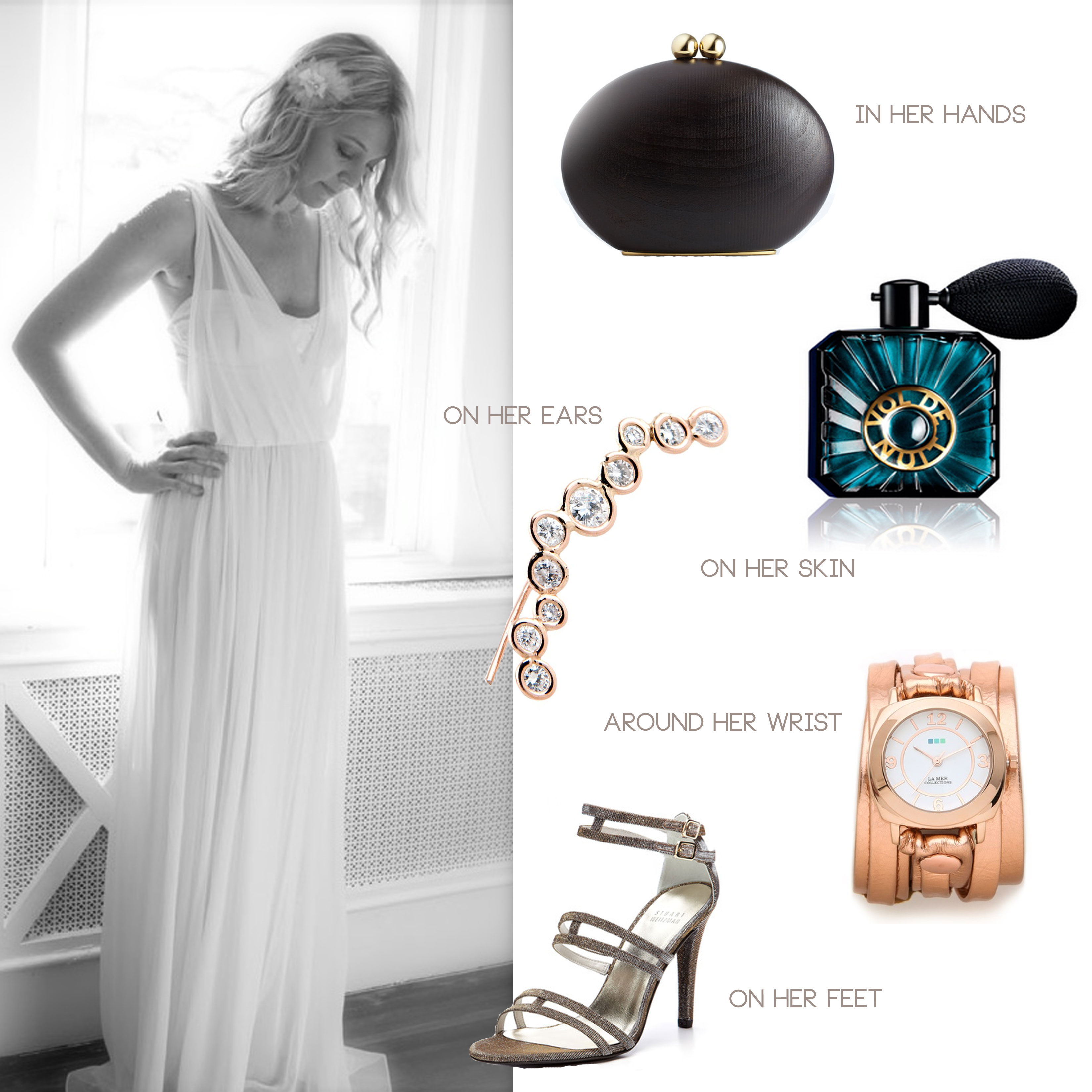 Wedding Features: Daisy Gown: Winifred Bean | La Mer Odyssey Case Layer Wrap Watch via ShopBop | Guerlain Vol de Nuit Perfumed Shimmer Powder via AHALife | Oval Wooden Clutch via Malini Murjani | Ear Cuff via Jacquie Aiche | Stuart Weitzman Traffic Sandal via  Shoebox New York |